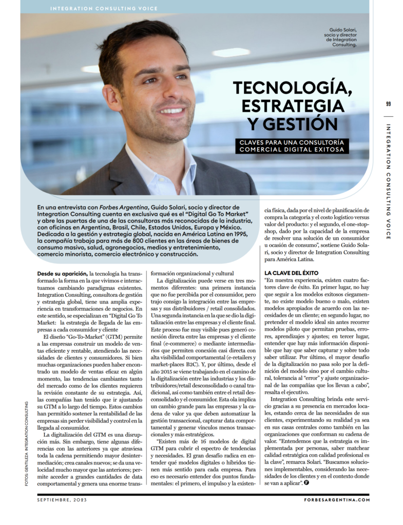 Integration was featured in an article by Forbes Argentina on the topic of digital go-to-market. In the piece, Integration partner Guido Solari shares key insights and first-hand experience about adopting a right-fit digital go-to-market strategy for promoting the business as well as effectively staying on top of ever-shifting consumer needs and behavior.